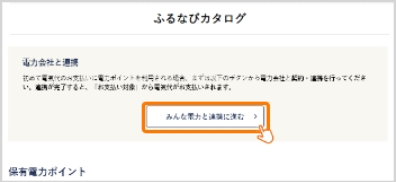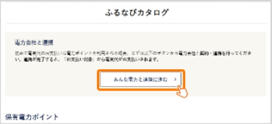 ふるなびマイページ内「保有電力ポイント確認」に移動して、ページ上部にある「電力会社と連携」内の「みんな電力と連携へ進む」ボタンを押してください。